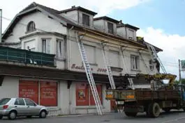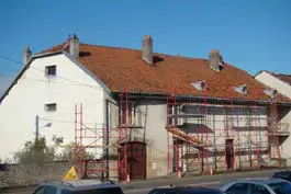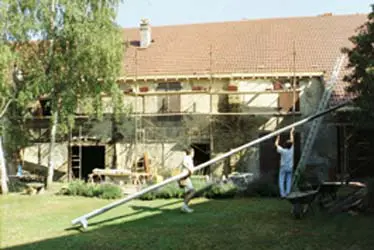 2.3 Zet de gordingen (pannes) op de spanten en in de dragende muren (pignons) weer zo goed mogelijk horizontaal en recht. Hiervoor worden de pannes waar nodig met een hydraulische krik opgevijzeld. De dragende uitsparingen in de muren worden opgemetseld; leg er geen hout of plaatmateriaal onder, maar gebruik alleen steenachtig materiaal en een cement/kalkspecie. Op de spanten worden de pannes uitgeklost en door grote klossen (échantignoles) tegen afglijden beveiligd, zie afbeelding 3. Rechts in beeld is de balk te zien waarmee de panne is opgevijzeld.