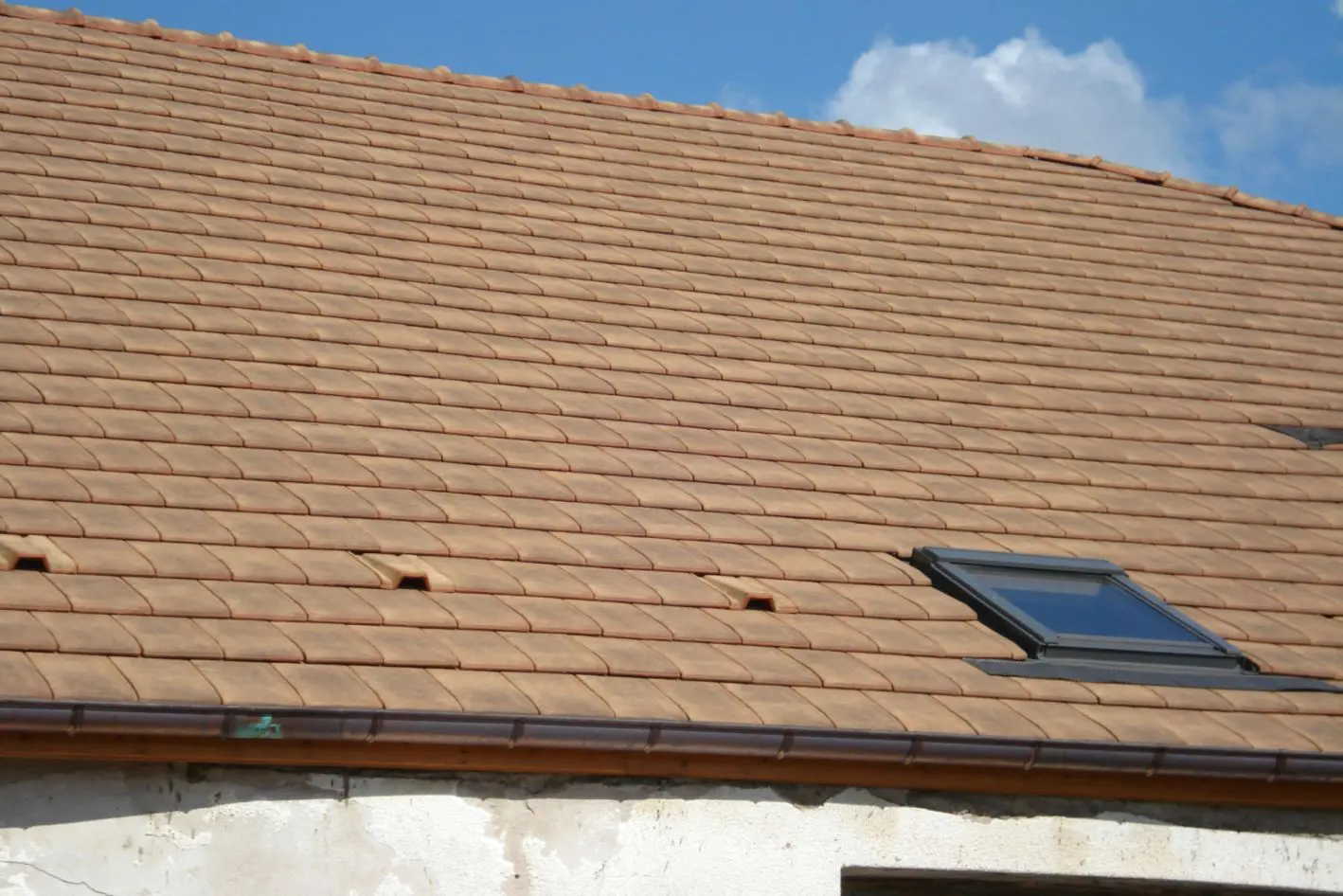 In het grote vlak worden de rijen pannen gewoon één voor één gelegd. Moderne pannen (tuiles mécaniques) worden normaal van rechts naar links gelegd zoals op afbeelding 9. Aan de voet van het dak, bijv. in de derde of vierde rij van onderen, legt men om de 3 à 4 m een beluchtingspan (chatière) of een beluchtigsstrook onder een gewone pan, netzo in de derde rij van boven (als men geen nok met beluchting toepast, zie 4.2). En waar een beetje licht op de zolder nodig is, legt men glazen pannen, die bij ieder model dakpan bestaan. Overigens chatières: deze zijn niet bedoeld voor de poezen, maar zij moeten juist vogels, muizen en ander ongewenst gedierte tegenhouden terwijl de lucht ruime toegang krijgt. De chatières van een ander dak zijn op afbeelding 10 te zien.