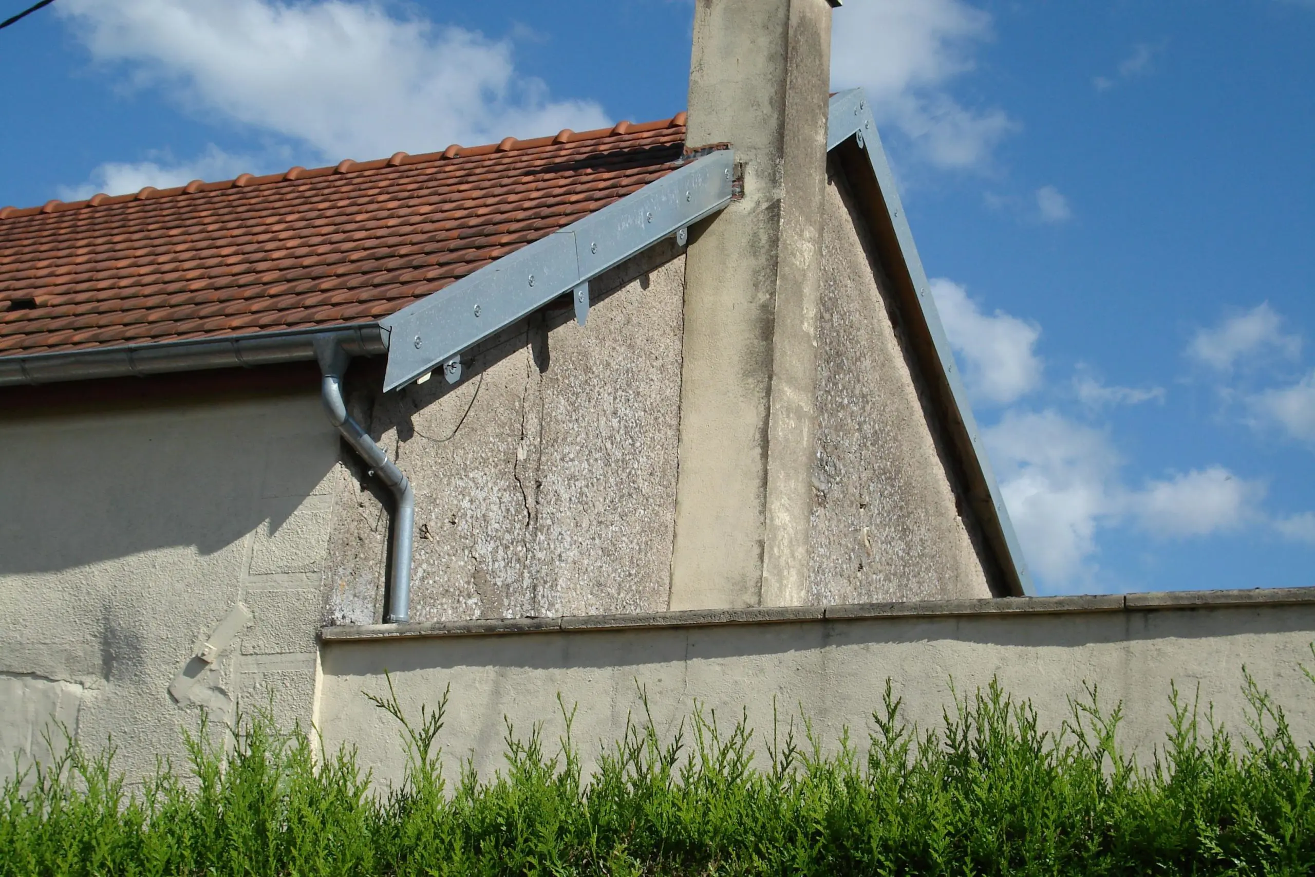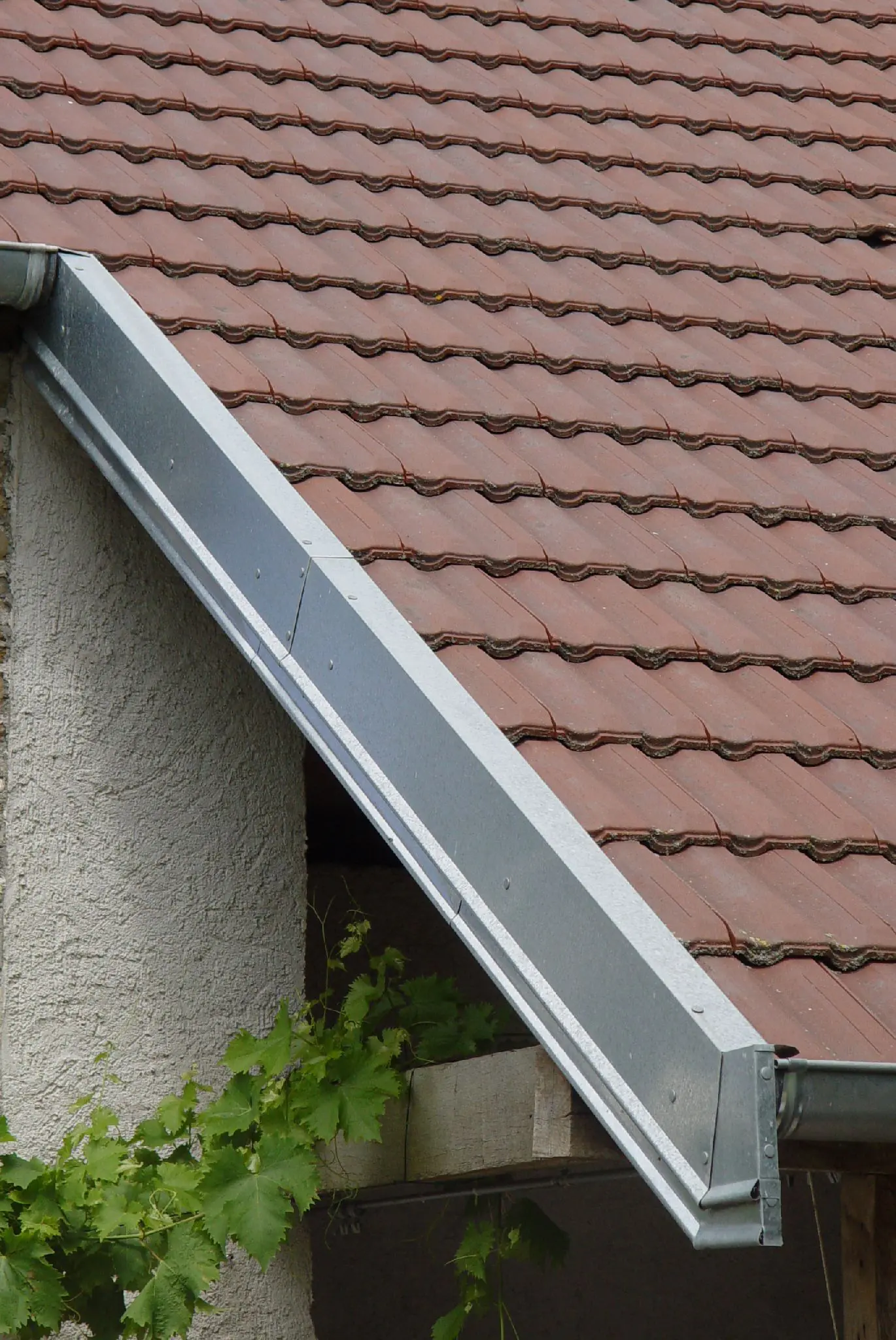 In Nederland worden de dakranden op de gevelmuren met een uit twee planken bestaande dakveer of met randpannen afgewerkt. In Frankrijk bestaan bij de meeste moderne pannen ook randpannen, tuiles de rive, een model voor rechts en een voor links, afbeelding 11. Bij traditionele daken heb ik meer zinken randafwerkingen gezien. Tegen de gevel wordt dan een plank geplaatst en hierop worden gezette zinken profielen gespijkerd, les rivages, die over de dakpannen heen grijpen. Deze profielen zijn bij de bouwmarkten in standaardprofielen en -lengtes te vinden. De rivages kunnen uit een of twee delen bestaan, en zij worden meestal met sierrozetten of sierspijkers vastgezet, en natuurlijk met onderlinge overlapping. Het model is vaak streekgebonden. Zie afbeeldingen 12 en 13.