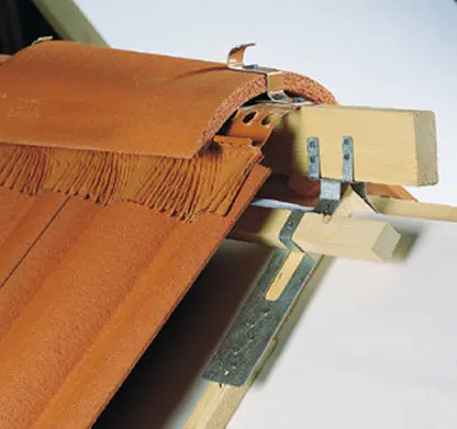Omdat de schuin afgesneden pannen (dit wordt met een diamantschijf in de haakse slijper gedaan) soms weinig houvast hebben, zijn haken en klemmen nodig om deze op hun plaats te houden. Ook deze zijn te vinden onder Monier. Kielgoten treden ook bij dakkapellen met een dak à deux pans op, zie afb.18. Als men probeert dit door een opgelegde loodslab af te werken (afbeelding 19) zijn problemen te verwachten.