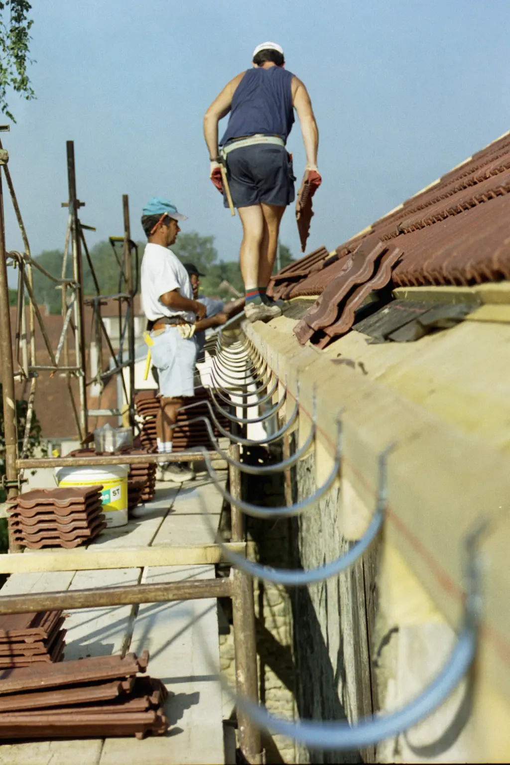 Als het alleen om de inspectie van boven of het vervangen van enkele pannen gaat zou ik een ramoneur of dakdekker vragen het voor me te doen. De kosten en moeite voor het kopen/huren/lenen van goed klimmateriaal zijn meestal hoger dan de lage prijs, die deze mannen berekenen – en zij hebben het goede klimmateriaal in huis (resp. op hun auto).