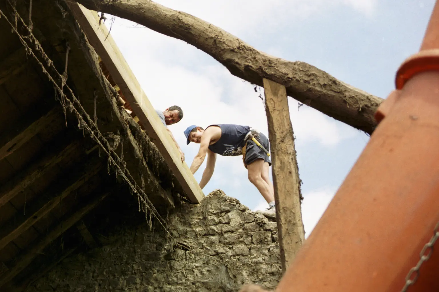 2.4 Vervang gordingen (pannes) waarvan de in de buitenmuren liggende koppen door rot aangetast zijn of leg van de muur tot het eerste spant een nieuwe ernaast, als de oude nog op ten minste twee spanten draagt. Dit is bij de balken in afbeelding 4 dringend gewenst, de verrotte balkkoppen waren hier meer dan provisorisch weer in de muur opgevangen.