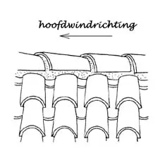2.8 Dan volgt de verdere dakopbouw, bijvoorbeeld met (van onder naar boven) dakbeschot of onderdakfolie, contralatten (tengels), panlatten, dakpannen, zie afbeelding 8. Zodra de halfdoorlatende baan uitgerold is, moet deze met tengels op de sporen vastgespijkerd worden. De tengels lopen in de vallijn van het dak (van nok naar dakvoet); behalve voor het vastzetten van de onderdakfolie zorgen zij voor voldoende ventilatie onder de pannen en voorkomen het ophopen van vuil boven de panlatten. Onderdakfolie (écran de sous-toiture) is een halfdoorlatende microporeuze baan; halfdoorlatend of semi-permeabel betekent waterkerend en winddicht, maar damp-open. Deze banen zijn van een speciaal plastic of bestaan uit gebitumineerd papier of vilt, papier goudronné, toile goudronneé.