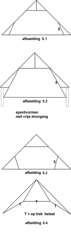 – Sommige spantvormen hebben een ongehinderde doorgang op de zolderverdieping, zie afb. 5.1 en 5.2; hetzelfde effect wordt door een ‘kreupele schoor’ bereikt, zie afb. 5.3.