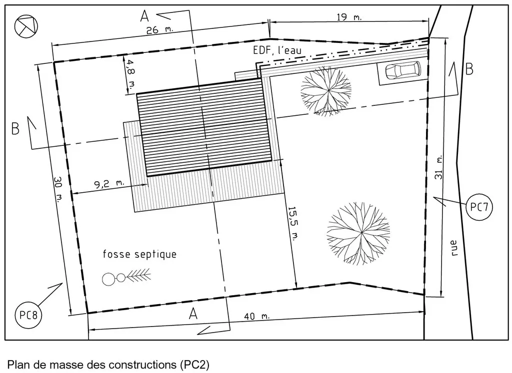 Een Plan de masse des constructions (PC2) toont de ligging van het gebouw in het terrein en de terreininrichting. In de voorbeeldtekening is te zien wat daarin moet worden vermeld. De water- en elektraleiding en de fosse septique worden alleen ingetekend wanneer deze worden aangelegd. Ook hier de vermelding van de opnamerichting van de foto’s.