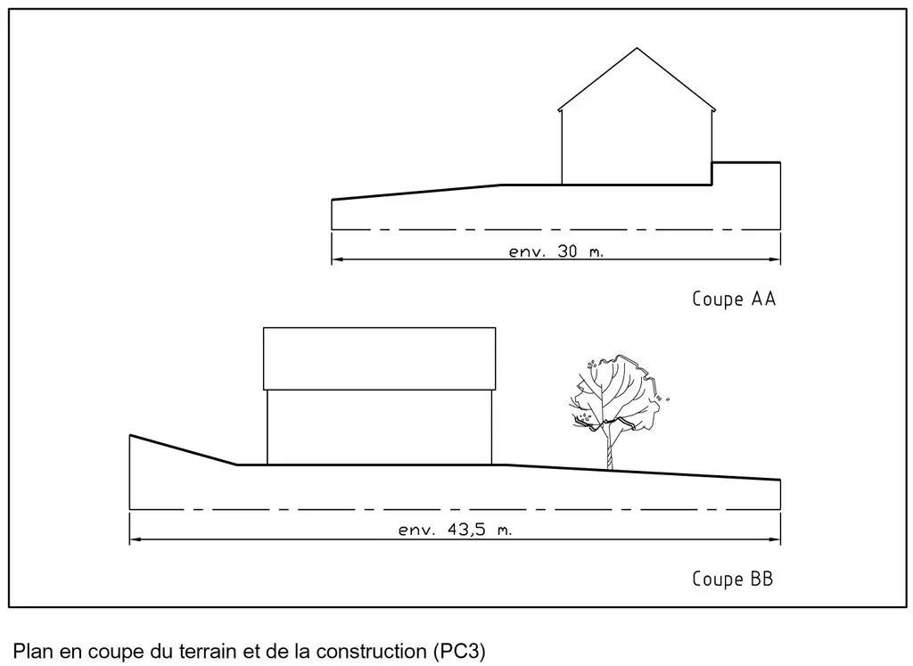 Een Plan en coupe du terrain et de la construction (PC3) geeft een doorsnede door het terrein en het gebouw, zodat zichtbaar wordt hoe het gebouw in het terreinprofiel is ingepast. Het terrein wordt doorsneden langs de lijnen AA en BB uit het Plan de masse (PC2), waarbij de pijlen de kijkrichting aangeven.