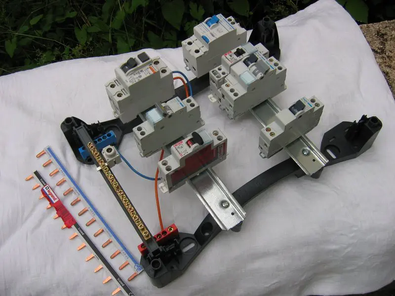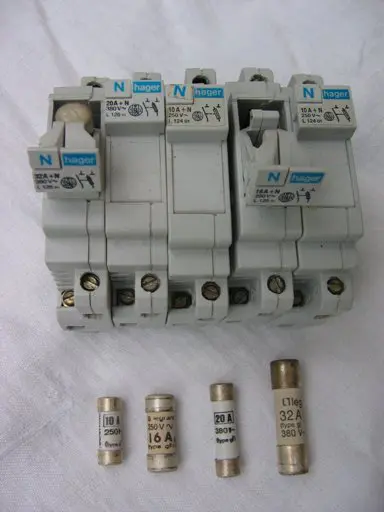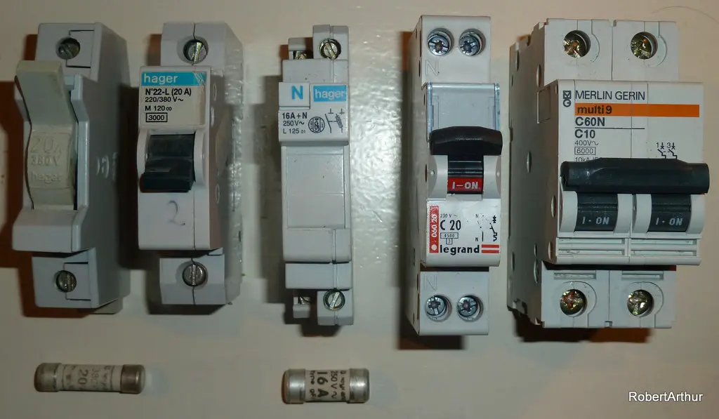 Van links naar rechts: een unipolaire zekeringhouder, een unipolaire disjoncteur, een bipolaire zekeringhouder, een standaard bipolaire disjoncteur en tenslotte een bipolaire disjoncteur met een dubbele stroombeveiliging. Niet alleen in de phase, maar ook in de neutre.