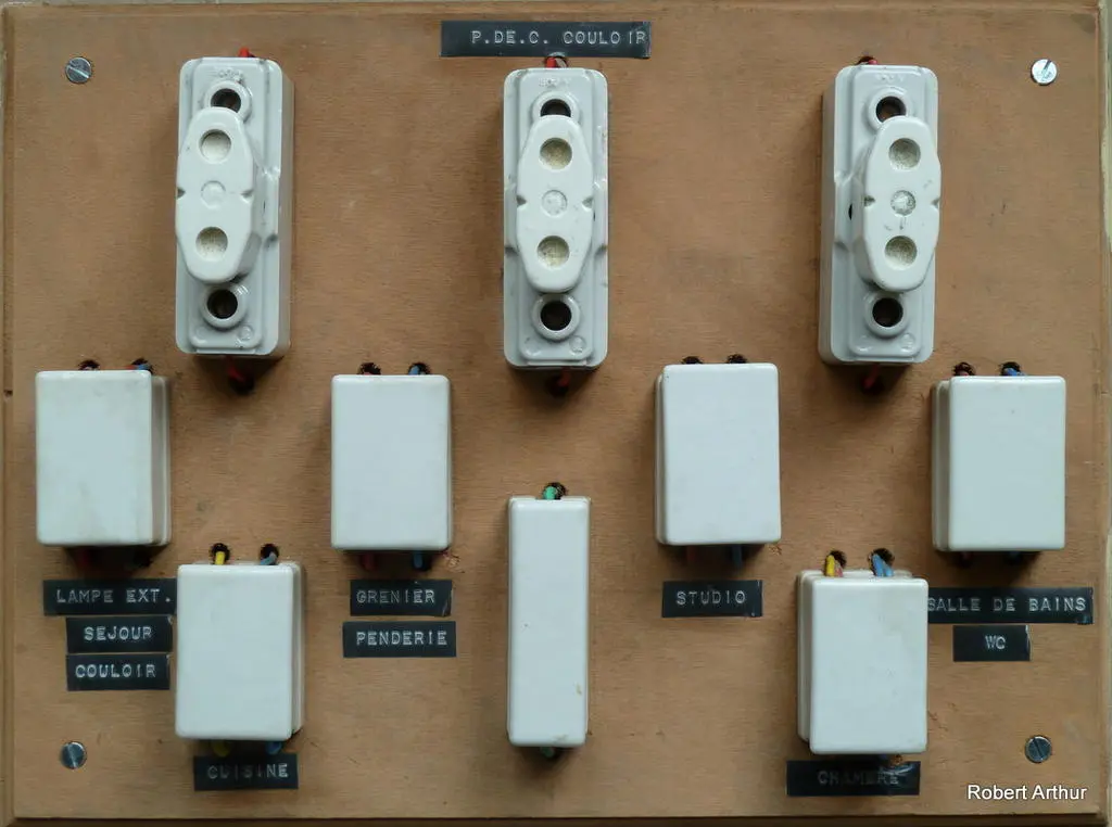 3.1. In de oudste groepenkasten die je tegen zou kunnen komen – een houten plank met ‘kinderspeelgoed’ erop – zitten zekeringen die bestaan uit een miniatuur porseleinen houder waar aan de onderkant een stukje weerstandsdraad is vastgeschroefd (coupe circuit à tabatière). Om nog even door te gaan met deze historische toelichting: een tabatière is, of beter gezegd was, een snuifdoos. Een klein wit porseleinen doosje met een dekseltje. De modellen die daarna hun entree maakten, zijn de porte-fusibles à broches en de porte-fusibles à cartouche. Met kleine smeltzekeringen van het type zoals dat in elektronische apparaten wel wordt gebruikt. Hier past slechts één advies: onmiddellijk slopen en (laten) vervangen door een moderne groepenkast. Soms worden ze op een vide-greniers nog wel eens aangeboden, dit soort oude groepenkasten. Maar dan moet de potentiële koper wel erg romantisch of nostalgisch zijn, om dit soort antiek te kopen. Maar wie weet levert het nog een paar euro op, je weet maar nooit.