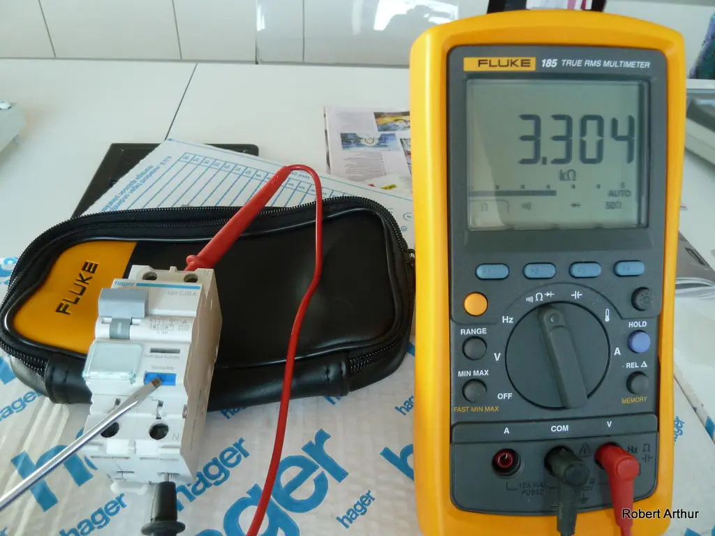 Testknop van aardlekschakelaar in werking: met het ingebouwde weerstandje van 3300 Ohm kan een foutstroom worden opgewekt van ongeveer 70 mA, ruim boven de 30 mA grens.