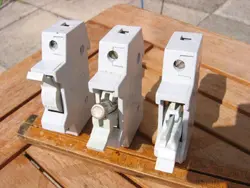 3.3. Meer van deze tijd zijn de modulaire coupe-circuits, die in de modernere groepenkast eenvoudig op de daarin gemonteerde draagrail (DIN-rail) kunnen worden vastgeklikt. Ze dienen voorzien te zijn van het NF-USE keurmerk, en zijn verkrijgbaar in vijf verschillende stroomsterktes: 10, 16, 20, 25 en 32 A. De inwendige afmetingen van deze modules zijn verschillend. Zo voorkom je dat je een te zware zekering gebruikt, maar het is altijd weer even zoeken voor je de juiste zekering te pakken hebt als er wat misgaat.