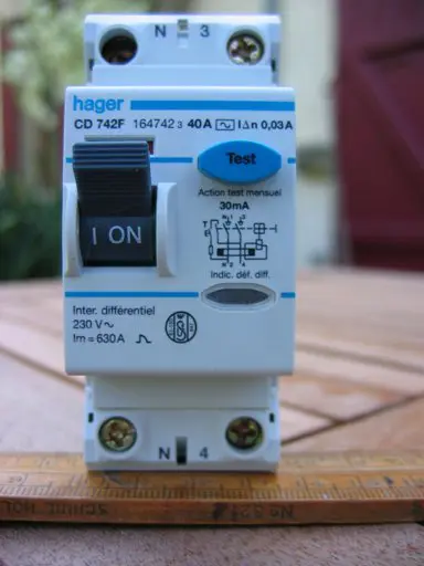 3.5. En dan nu de aardlekschakelaar, de interrupteur différentiel. Ook wel aangeduid als DDR (Détection Différentielle à courant Résiduel). Deze aardlekschakelaars zijn volgens de normen van NF C 15-100 verplicht in nieuwbouw en bij renovatie. En voor de eigen veiligheid ook beter maar aan te brengen in bestaande installaties, zeker voor badkamers en keukens. Wanneer er zich een lekstroom van 30 milli-ampère of meer voordoet – een defect snoer van de haardroger, en tegelijkertijd raak je de kraan aan – dan schakelt de aardlekschakelaar razendsnel de stroom uit naar alle groepen die daarop zijn aangesloten. Dat spaart mensenlevens. Let wel: volgens de nieuwe normen moet alles wat in huis is aangesloten via een aantal van zulke 30 milli-ampère aardlekschakelaars lopen., minimal twee stuks.