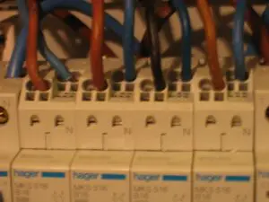 En nog een voordeel: wanneer een groep door overbelasting of een kortsluiting uitgeschakeld wordt, zie je in de groepenkast meteen welke het is. Het schakelaartje (manette) van de disjoncteur is dan naar beneden geklapt. En je hoeft geen nieuwe zekering te zoeken of te kopen. Bij deze disjoncteurs worden zowel de stroomtoevoerdraden (al dan niet met een aansluitstrip) als de de départ draden vastgeschroefd. Maar met gevoel. Draai je ze te vast, dan loop je het risico dat je de schroefgang van de aansluiting beschadigt. Dat merk je vanzelf: opeens draait het soepel door. En zit de aan te sluiten draad niet vast, en de module is meteen onbruikbaar. En te los is ook niet goed. Ergens er tussen in dus. Sommige merken hebben mijn voorkeur: die kun je genadeloos aandraaien, en geven geen krimp. Andere doen al moeilijk wanneer je ze maar even iets te vast aandraait. Voor de perfectionisten de volgende elektriciens tip: haal met de striptang twee keer zoveel isolatie van het draadeinde af, en buig die ruim twee centimeter koper vervolgens in een kleine U vorm met combinatie- of puntbektang. De aandrukkracht in de aansluiting wordt nu gelijkmatiger verdeeld, en de overgangsweerstand gehalveerd. De enkele koperen draadeindjes willen als ze net niet vast genoeg zitten wel eens verschuiven of los gaan zitten wanneer je er bij vervolgwerkzaamheden in de groepenkast tegenaan komt. Maar dit is dus ook merkafhankelijk: niet de allergoedkoopste merken aanschaffen zou ik zeggen.
