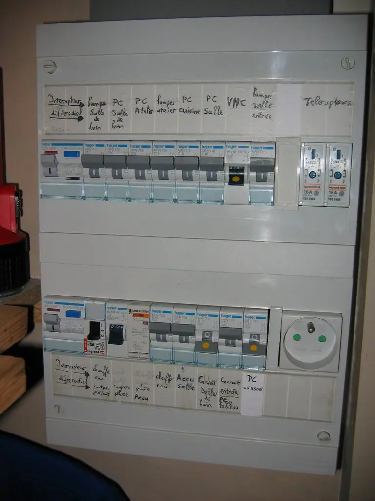 Nog even iets over de foto hierboven van een kleine Franse groepenkast. Wat hangt daar allemaal aan? Het is seulement un petit studio zouden de Fransen zeggen, minder dan 35 m² oppervlakte, een gastenverblijf. Een redelijk ruime zit/slaapkamer met mini-inbouwkeukentje, een elektrische verwarming, een douche, de gang, een kleine werkkamer (atelier) en een elektrische boiler voor het warme water. Niet overdreven veel, maar in de groepenkast tikt dat toch aardig aan. En dat is dan nog la solution minimale wordt mij vrolijk meegedeeld in de gids van een Franse fabrikant. Maar van hem kan ik natuurlijk nooit genoeg kopen, er valt altijd wel iets te verbeteren of uit te breiden. Nog een extra disjoncteur différentiel voor bijvoorbeeld een wasmachine. Zou daar wat mis mee gaan, dan blijft de rest van de verlichting en de stopcontacten het gewoon nog doen. En dat zorgt dan voor een meilleur confort d’exploitation.