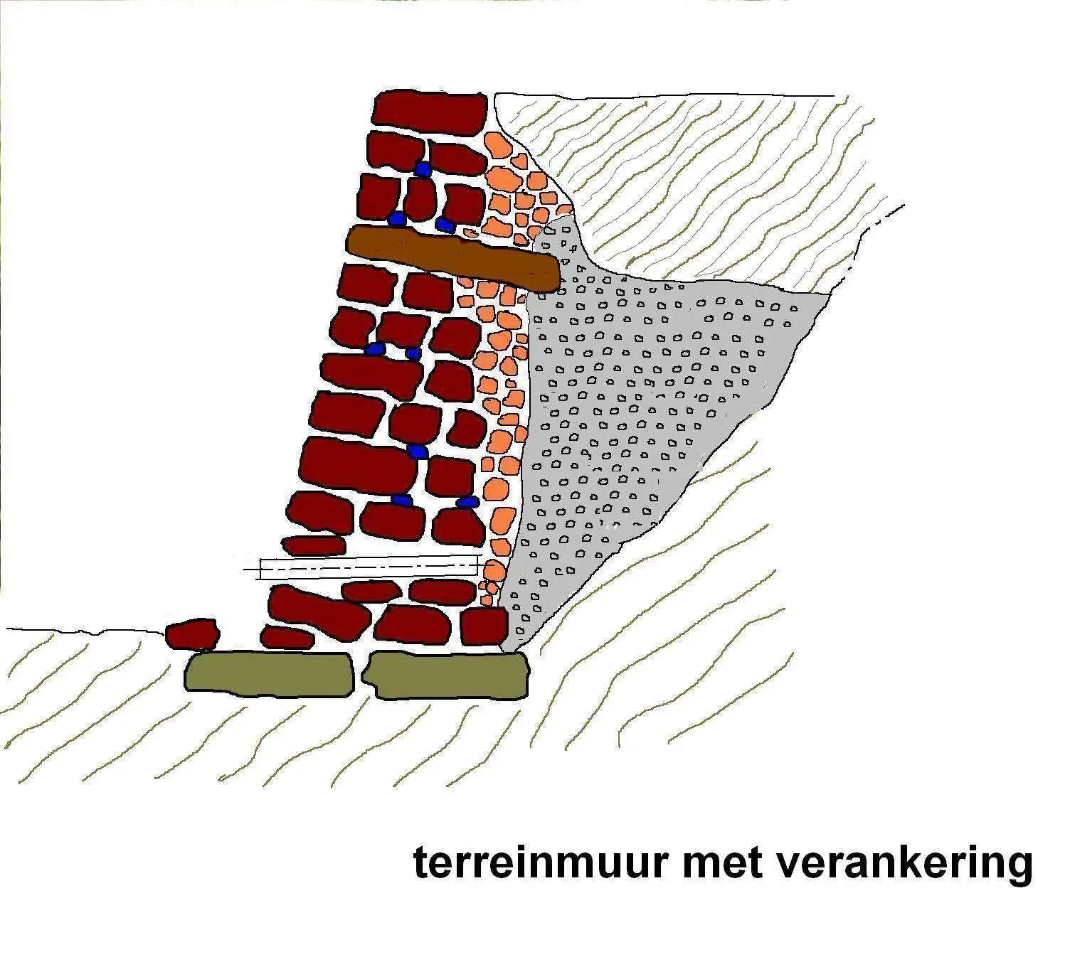 Terreinmuur met verankering door een lange steen (boutisse, parpaing)