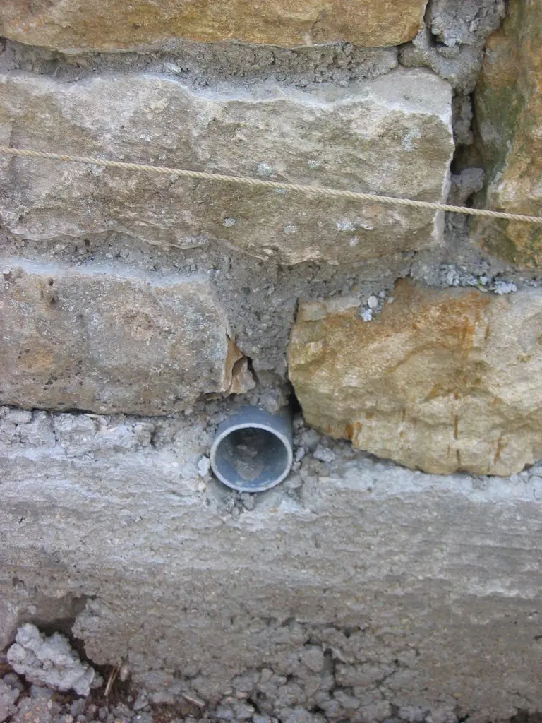 Voor de drainage heeft men geribbelde slang (tuyau annelé) gebruikt omdat die beter in de daarvoor liggende muur van natuursteen te leggen is.