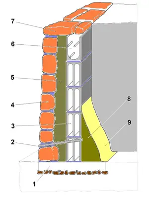 Bij dit soort ‘spouwmuur’ kan men zo nu en dan een van de gebruikelijke stalen spouwankers gebruiken om het parpaing-blad en het natuurstenen blad met elkaar te verbinden.