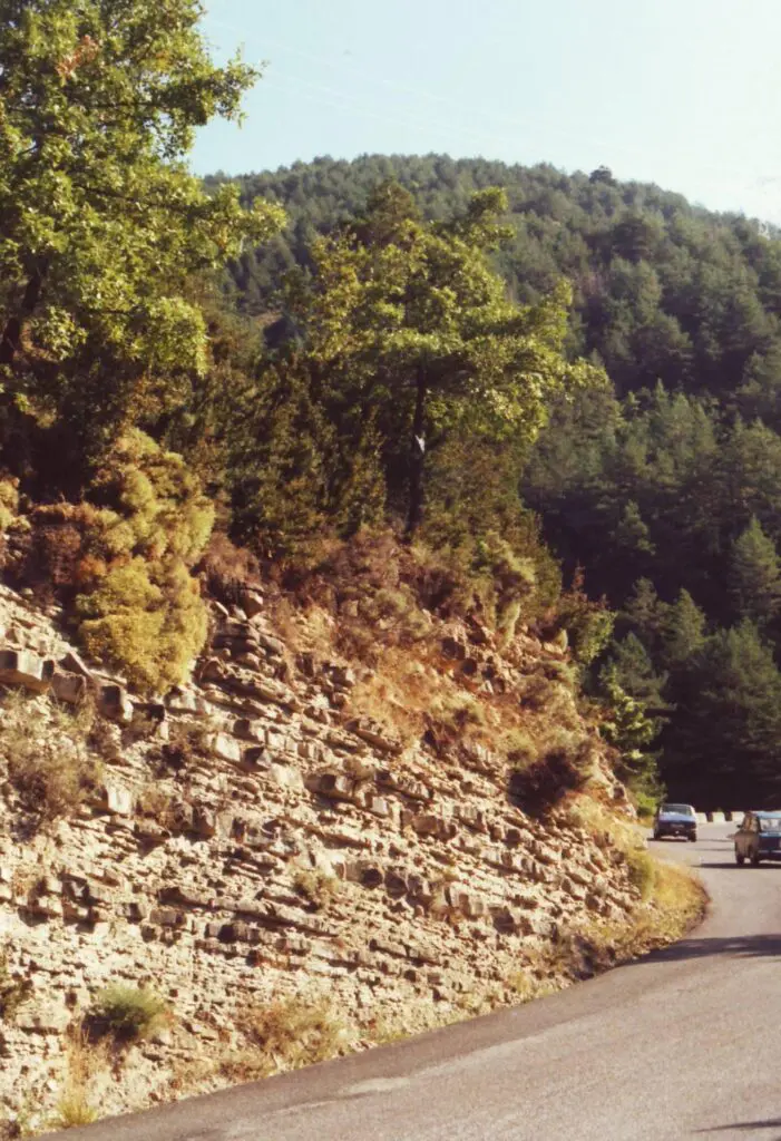 Dit is geen prehistorische droge muur maar sedimentgesteente van gelijkmatige dikte per laag