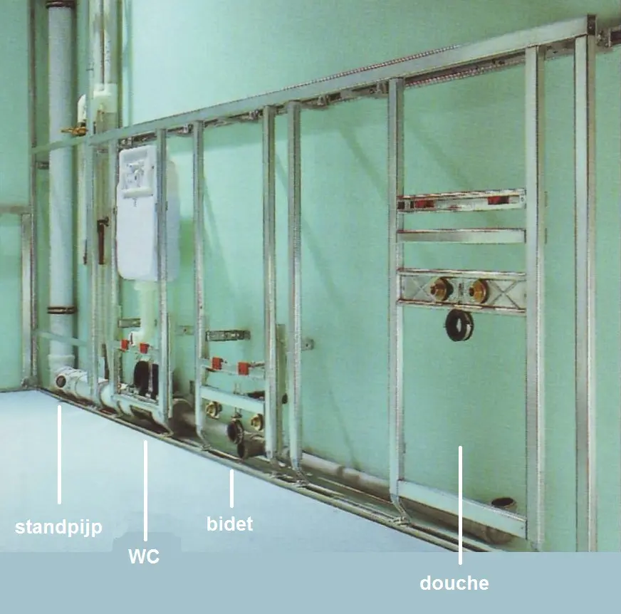 Het vinden van het juiste tracé voor de rioolbuizen is wegens hun grote diameter en de noodzaak van een constante afschot vaak niet makkelijk. Het aanleggen onder de vloer is goed te doen als in de daaronder gelegen verdieping een verlaagd plafond geplaatst wordt. Hierbij treden helaas vaak geluidsproblemen op. Een handige oplossing is de sinds ca. 30 jaren vooral bij renovatieprojecten toegepaste voorwandinstallatie. Alle sanitairelementen worden aan frames, die ca. 20 cm diep en 120 cm hoog zijn, gemonteerd en de afvoerleidingen worden tussen de bestaande wand en deze frames gelegd. Diverse leveranciers bieden hiervoor complete systemen aan en de prijzen zijn nu ook langzamerhand redelijk. Zie afb.13 en 14.