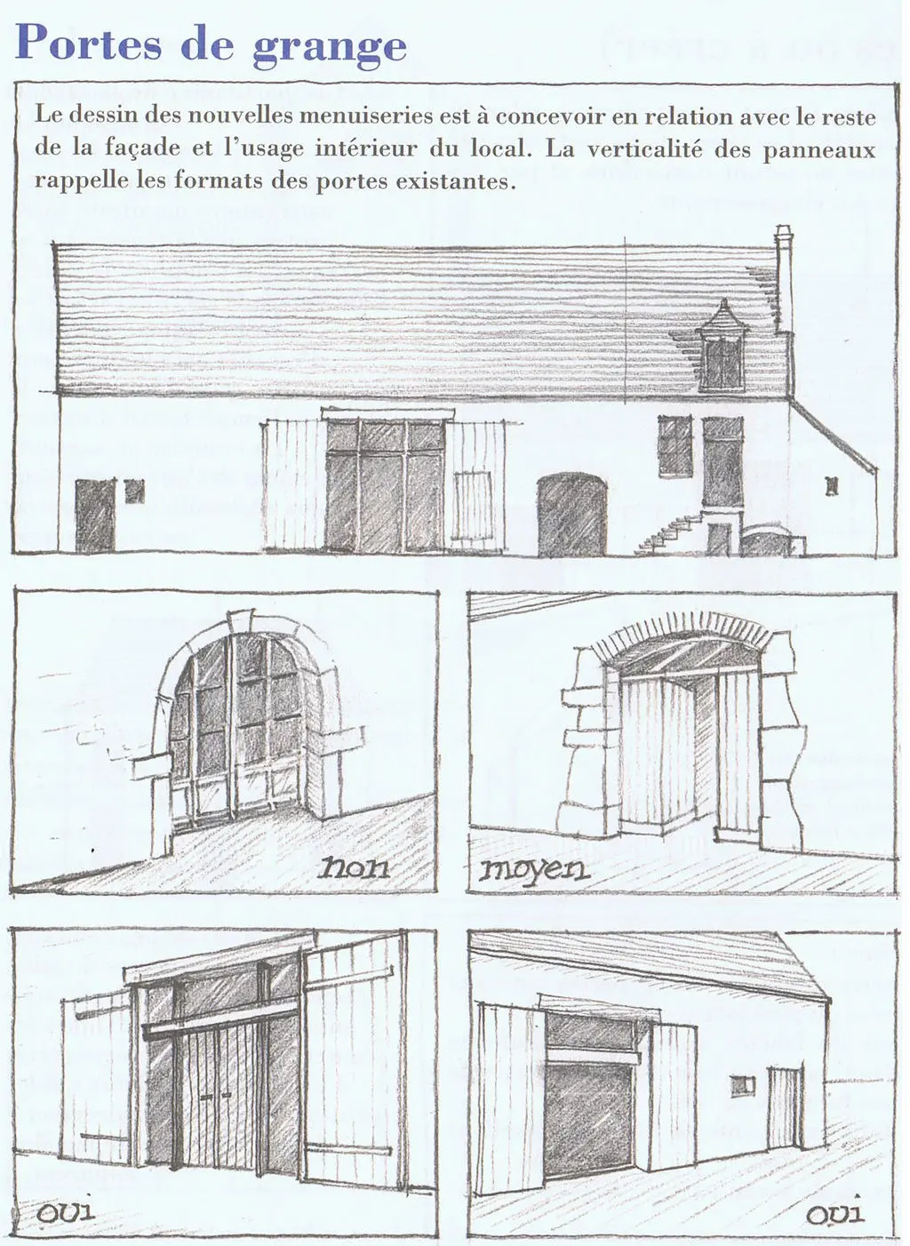 De glasinvulling van de hoge staldeur is een aandachtspunt. In de Morvan is niet iedere kozijnvorm toegestaan. Onderstaande afbeeldingen geven aan naar welke oplossingen de voorkeur uitgaat.