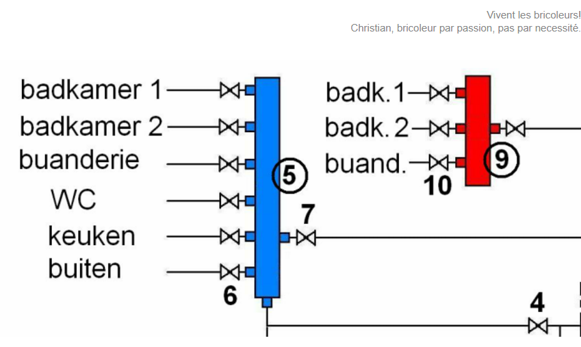 Met de boven gegeven regels en aanbevelingen zijn de diameters van de leidingen te bepalen. Verder hadden wij het over de leidinglengtes. Korte leidingen zijn, vooral bij warm water, van voordeel. Als het mogelijk is zou ik steeds de warmwatervoorziening dicht bij de badkamer(s) plannen (of de badkamers dicht bij de warmwatervoorziening (combi-CV of boiler)). Maar helaas is dit in een bestaand huis vaak niet mogelijk. Als lange warmwaterleidingen niet te voorkomen zijn, dan is een recirculatieleiding een oplossing (un boucle): Door een kleine pomp wordt warm water steeds van de boiler/CV langs alle verbruikers en terug gepompt. Zodoende heeft iedere verbruiker steeds warm water zonder wachttijden ter beschikking. Dat is in hotels en ziekenhuizen standaard. U kunt de pomp aan de lichtschakelaar van de badkamer(s) koppelen om onnodig permanent pompen te vermijden of u kunt een separate schakelaar voor de pomp plaatsen.Bij de detailplanning van de waterleidingen is een beetje inventiviteit gevraagd, als men niet overal leidingen in het zicht wil hebben. Wanneer ergens de fantasie en het interdisciplinaire denken van een klusser gevraagd is, dan hier.