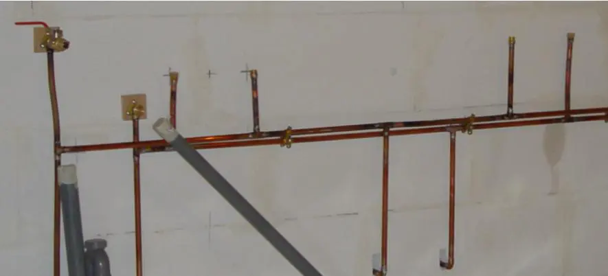 Alle leidingen in huis zijn traditioneel van koper met een wanddikte van 1 mm. Of men harde leidingen van getrokken koper neemt (cuivre écroui ) of zacht koper van de rol (cuivre recuit en couronne) is een kwestie van persoonlijke voorkeur. Het harde koper moet voor het buigen warmgestookt (uitgevlamd) worden, tenminste als dikke leidingen met een eenvoudig buigijzer gebogen moeten worden of men het met de hand wil buigen. Ik prefereer hard koper, want dat is waar nodig zacht te stoken, terwijl zacht koper nooit hard en recht te maken is.